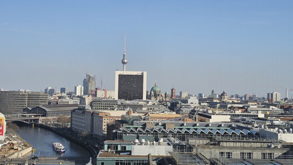 Daran anschließend besuchten wir die gläserne begehbare Glaskuppel. Sie ermöglicht es den Bürgern, über den Köpfen der Abgeordneten zu spazieren und von oben dem Parlament auf die Finger zu schauen. An diesem wunderschönen, milden und sonnigen Tag hatte man einen guten 360-Grad-Ausblick und konnte auf der Aussichtsplattform verweilen oder die 230 Meter bis zur Spitze der Kuppel laufen.